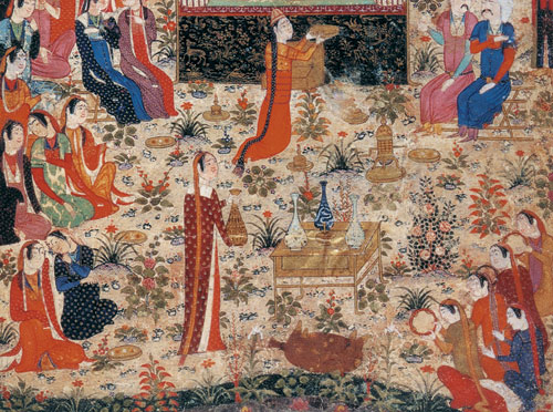 庭院筵席局部。1396年制品,倫敦大英圖書館藏。圖中木桌上擺設(shè)著作為容器使用的玉壺春瓶