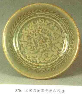 宋代重要民間瓷窯,已在臨汝發(fā)現(xiàn)嚴和店、軋花溝、下任村、東溝、陳溝、崗窯、石板河、桃木溝、陳家莊、蜈蚣山等處遺址。燒瓷品種以耀州窯系統(tǒng)的青釉瓷器和鈞釉瓷器兩大類為主,此外還燒制北方常見的白釉綠彩、白地黑花、白釉劃花、黑釉、綠釉等品種。青釉器物有光素、印花、刻花、劃花幾種,陜西耀州窯器的器形、紋飾、在臨汝窯都可以找到,只是質(zhì)地比耀州略為遜色,時代比耀州晚,明顯是受其影響。印花紋飾有海水魚紋、嬰戲海水、纏枝牡丹、纏枝菊花、分格折枝花、折枝菊等。刻花裝飾刀鋒不如耀州犀利。劃花有纏枝花卉,光素碗為厚唇小足、足粘砂粒、并有醬黃色,與耀州相似,但總體看耀州比臨汝制作得更為精細。鈞釉器物絕大部分為盤、碗,盤有折沿、花口、圓口等不同形式,有的飾以紅色斑點。在臨汝8處鈞釉窯址中幾乎同時都發(fā)現(xiàn)有青釉器,青釉中亦有帶紅斑者。(見圖376)