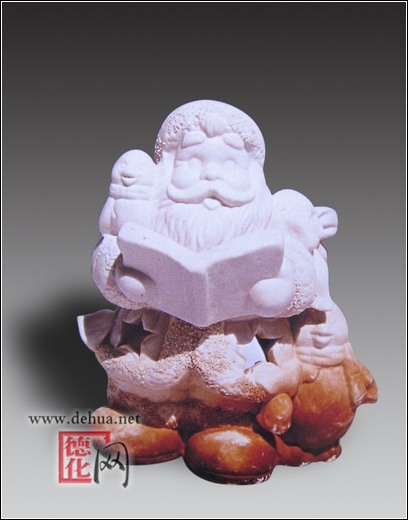 和藹慈祥的圣誕老人。每年12月25日的圣誕節(jié)一個宗教節(jié)日,是基督徒紀念耶穌降生的節(jié)日,是歐洲國家最大最熱鬧的節(jié)日。這一天,世界所有的基督教會都舉行特殊的禮拜儀式,大家相聚一堂,交換禮物,互寄圣誕卡,吃火雞大餐,布置精美的圣誕樹,還有圣誕老人的禮物和祝福(如圖4)。的圣誕老人就是清代德化窯專供外銷而特制的,潔白雅致、溫潤如玉的瓷質(zhì),將圣誕老人和藹可親的形象,表現(xiàn)得淋漓盡致,令人浮想連連。