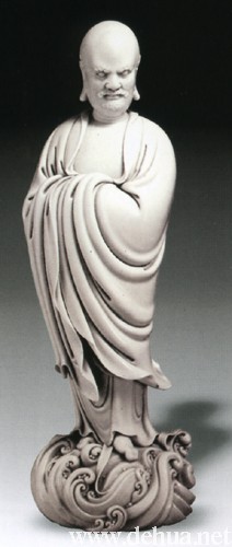 達(dá)摩容貌威嚴(yán),身材偉岸,雙手?jǐn)n袖于胸前,赤足立于波濤之上,取材于達(dá)摩一葦渡江故事。此尊塑像胎體厚重,潔白堅(jiān)實(shí),通體施象牙白釉,釉面純凈瑩潤,背部鈐有“何朝宗印”方形印章款。