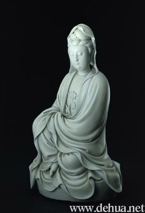 觀音盤膝而坐,面容慈祥,溫良嫻雅,帶有明顯的男子氣質;其衣紋線條柔潤流暢,頭部、酥胸、手腳等細部刻劃細膩,整尊塑像以象牙白為瓷質,將觀音善良、正直、莊嚴的神態(tài)表現得惟妙惟肖。背部鈐有“何朝宗”葫蘆形印章款。