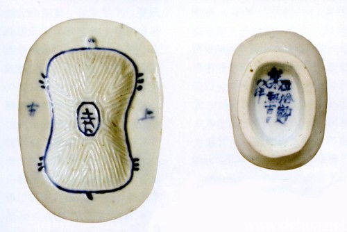 “象牙白”釉龜粿印,康熙五十八年(1719年),寬8厘米,長11.5厘米,龜粿印用青花點綴,釉水瑩潤,宛如凝脂,底部用青花銘有“康熙伍拾八年吉日 寶”等字樣。