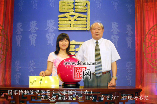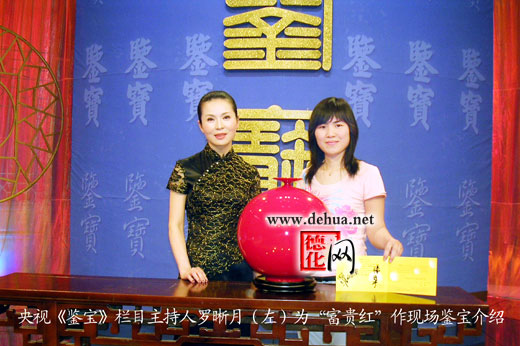2006年8月,央視《鑒寶》欄目對(duì)德化瓷器富貴紅“天地方圓”紅釉盤口球體瓶作現(xiàn)場(chǎng)鑒定評(píng)點(diǎn)。這是現(xiàn)代瓷器第一次進(jìn)入《鑒寶》欄目。