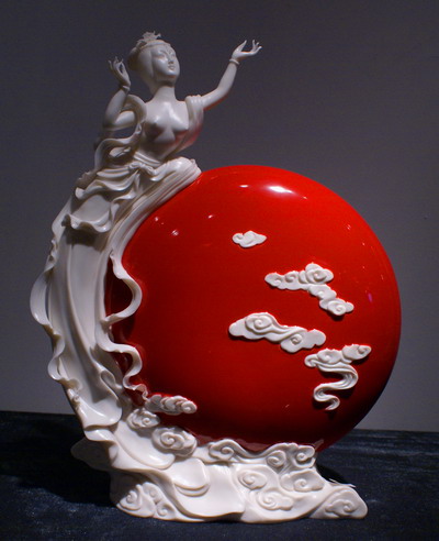 6月11日拍攝的德化陶瓷作品《海峽紅韻》。 "歷史的對話--德化古今陶瓷藝術展"于6月9日在福州舉行。展覽匯集了現代德化制瓷工藝大師的精品130余件,以及福建博物院館藏的珍貴文物30余件。德化瓷燒制技藝已被列入第一批國家級非物質文化遺產名錄。