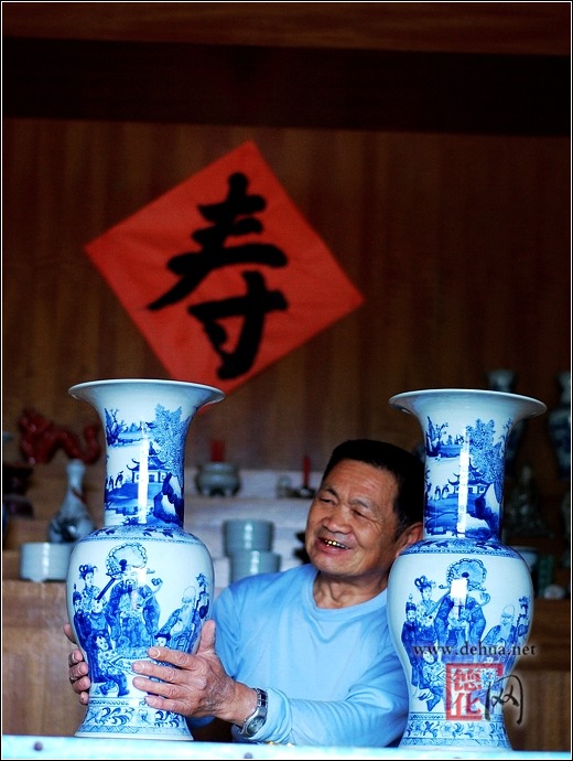 “5個兒子,除一個在部隊外,其他4個都從事陶瓷業(yè),卻沒有一個肯向我學(xué)手拉坯!”談到手拉坯這一傳統(tǒng)工藝的保護問題,顏金錫老人顯得有點茫然。他認為時代總是在不斷進步的,一樣事物被淘汰總有它的局限性,可是說起兒子們不學(xué)手拉坯,他的語氣中還是充滿遺憾。他說文化保護這個問題他不懂,賺錢多賺錢少他也不在意,但是他有一個小心愿,就是以后人們還能知道手拉坯、記住手拉坯。他告訴我們,70歲那年他特意制作了一對鳳尾尊青花瓷瓶以作生日紀念。