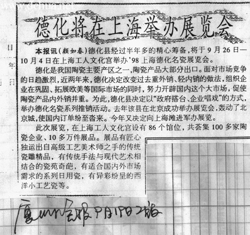 德化是我國(guó)陶瓷主要產(chǎn)區(qū)之一,陶瓷產(chǎn)品大部分出口。面對(duì)市場(chǎng)競(jìng)爭(zhēng)的日趨激烈,近兩年來(lái),德化決定改變過(guò)去重外銷、輕內(nèi)銷的做法,組織企業(yè)在鞏固、拓展歐美等國(guó)際市場(chǎng)的同時(shí),努力開辟國(guó)內(nèi)這個(gè)大市場(chǎng),促使陶瓷產(chǎn)品內(nèi)外銷并重。為此,德化縣決定以“政府搭臺(tái)、企業(yè)唱戲”的方式,舉辦德化名瓷系列推銷活動(dòng)。去年該縣在北京成功舉辦展覽會(huì),轟動(dòng)了北京城,使國(guó)內(nèi)訂單紛至沓來(lái)。今年又決定向上海灘進(jìn)軍辦展覽。