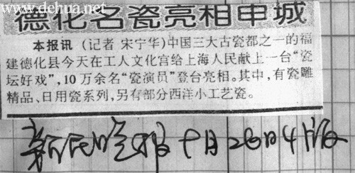 本報訊(記者宋寧華)中國三大古瓷都之一的福建德化縣今天在工人文化宮給上海人獻上一臺“瓷壇好戲”,10萬余名“瓷演員”登臺亮相。其中,有瓷雕精品、日用瓷系列,另有部分西尖小工藝瓷。