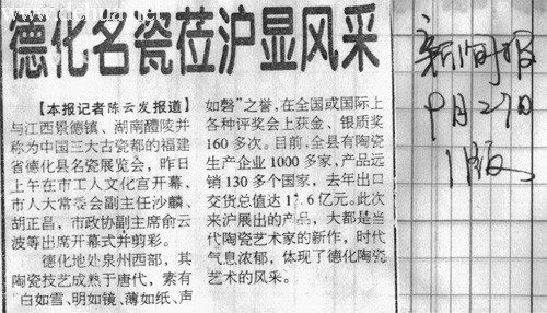 【本報(bào)記者陳云發(fā)報(bào)道】與江西景德鎮(zhèn)、湖南醴陵井稱為中國三大古瓷都的福建省德化縣名瓷展覽會,昨日上午在市工人文化宮開幕,市人大常委會副主任沙麟、胡正昌,市政協(xié)副主席俞云渡等出席開幕式并剪彩。