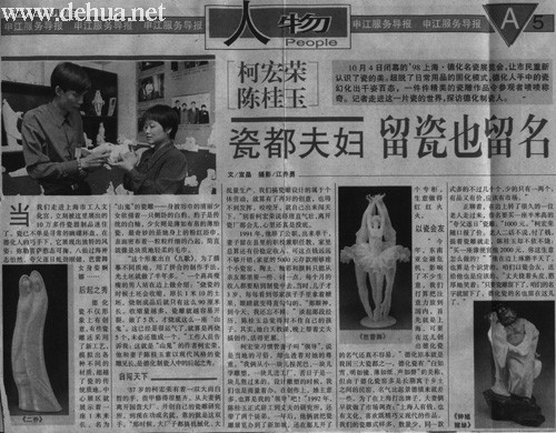 “今年,東南亞金融危機(jī),影響了不少生意,我們打算把注意力放到國內(nèi),首先就是上海,可要在這兒創(chuàng)出德化瓷的名氣還真不容易。”德化原本就是我國三大瓷都之一,德化瓷有“白如雪、明如鏡、薄如紙、聲如磬”的美稱,但由于德化瓷窯多是長期寓于鄉(xiāng)土之間的民窯,名氣比起景德鎮(zhèn)來就差一些。為了在上海打出牌子,夫妻倆早就做了市場調(diào)查:“上海人有錢,也有文化,喜歡既精巧又現(xiàn)代的作品。我們的瓷雕式樣多、數(shù)量少,同一款式多的不過幾十個,少的只有一兩個,有品又有價,應(yīng)該有市場。”