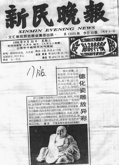 并利用象牙白的瓷質(zhì)作出各種不同姿態(tài)的瓷雕觀音、如來、達摩、羅漢、彌勒、八仙等精美絕倫、垂范后世的作品,使德化瓷雕登上國際瓷壇藝苑,并享有“東方藝術(shù)”精品之譽。 泉文 下圖為邱雙炯作品《彌勒》