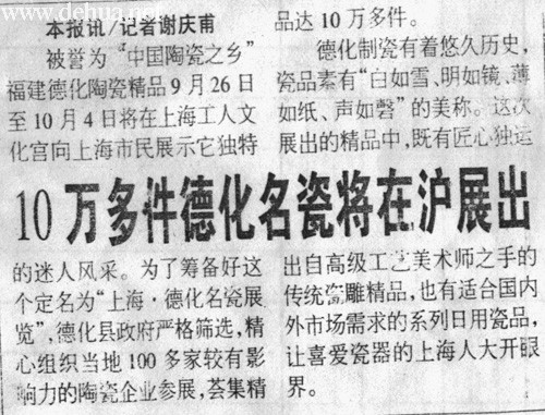 被譽(yù)為“中國陶瓷之鄉(xiāng)”福建德化陶瓷精品9月26日至10月4日將在上海工人文化宮向上海市民展示它獨(dú)特的迷人陬采。為了籌備好這個(gè)定名為“上海·德化名瓷展,覽”,德化縣政府嚴(yán)格篩選,精心組織當(dāng)?shù)?00多家較有影響力的陶瓷企業(yè)參展,薈集精品達(dá)lO萬多件。