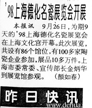 本報訊  9月26日,為期9天的"98上海德化名瓷展覽會在上海文化宮開幕。此次展覽,共設(shè)有86個館位,有100多家陶瓷企業(yè)參加,展品10多萬件。上海市委常委、宣傳部長金炳華到展覽館參觀。