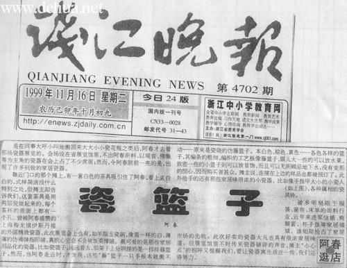 靠近門口的那個攤上,有一套白色的茶具吸引住了阿春,看上去白白的,式樣簡潔沒什么特別之處,但攤主卻告訴我們,這套茶具是用兩層瓷做起來的,每個茶杯的底面上都有一個孔。曾被阿春盛贊的上海梅龍鎮(zhèn)伊斯丹里的外國精致瓷器,此次展覽會上也有,如羊脂玉瓷碗,像雪一樣的白,薄薄的仿佛彈指即破,真擔心它會不會被飯菜撐破。最可愛的是那些家居用品化的瓷器。比如瓷籃子,遠遠看去,那架子上分明擺的是一排排藤籃子,然而,當阿春走近時,才發(fā)現,這些“藤”籃子是一只手根本搬不動——原來是瓷燒的仿藤籃子。本白色、棕色、黃色……各色各樣的籃子,其編條的粗細、編織的工藝極像藤籃子,眼兒大一些的可以放水果,致密一些的小籃子則可以放首飾,而且可以無所顧忌地下水,沒有變形的擔心,因而購買者甚眾。攤主說,連擺在上邊的樣品也都被預訂了。此外搶手的還有那些家居味很濃的小瓷器,比如像手指甲大小的小瓷人(如上圖),各種屬相的瓷風鈴。