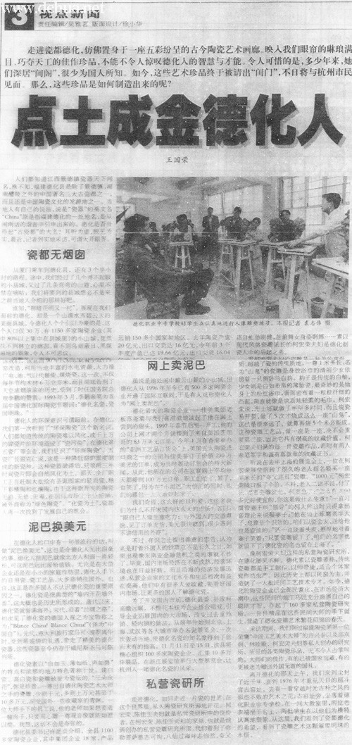 德化縣委書記許昆貞介紹,全縣1100多家陶瓷企業(yè),其中集團企業(yè)18家,產(chǎn)品遠銷150多個國家和地區(qū)。去年陶瓷產(chǎn)值20億元,出口交貨達16億元,今年前3個季度產(chǎn)值已達19.66億元,出口交貨16.04億元,居全國重點陶瓷業(yè)前列。