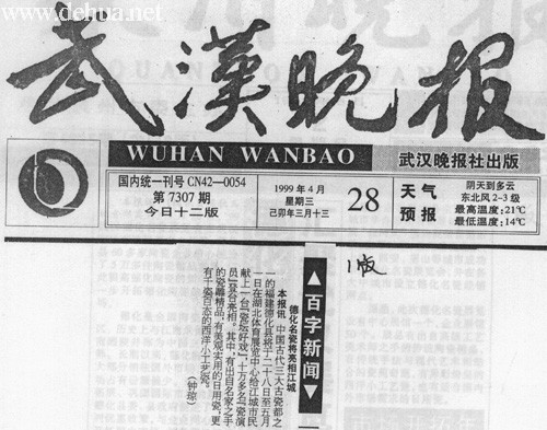 本報(bào)訊中國(guó)古代大古瓷都之一的德化縣將于二十八日至五月一日在湖北體育展覽中心給江城市民獻(xiàn)上一臺(tái)瓷支好戲,十萬(wàn)多名瓷演員登臺(tái)亮相。其中,有出自名家之手的瓷雕精品,有美觀實(shí)用的日用瓷,更有千姿進(jìn)態(tài)的西洋小工藝瓷。(鐘瓊)