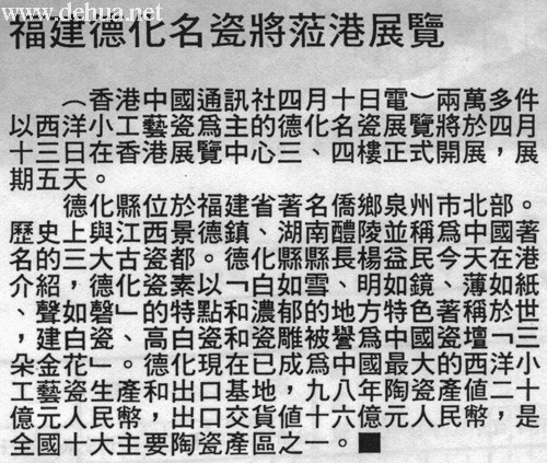 德化縣位于福建省著名僑鄉(xiāng)泉州市北部。歷史上懷江西景德鎮(zhèn)、湖南醴陵并稱(chēng)為中國(guó)著名的三大古瓷都。德化縣縣楊益民今天在港介紹,德化瓷素以『白如雪、明如鏡、薄如紙、聲如磬』的特點(diǎn)和濃郁的地方特色著稱(chēng)於于世,建白瓷、高白瓷和瓷雕被譽(yù)為中國(guó)瓷壇『三朵金花』。德化現(xiàn)在已成為中國(guó)最大的西洋小工藝瓷生產(chǎn)和出口基地,九八年陶瓷產(chǎn)值二十億元人民幣,出口交貨值十六億元人民幣,是全國(guó)十大主要陶瓷產(chǎn)區(qū)之一。