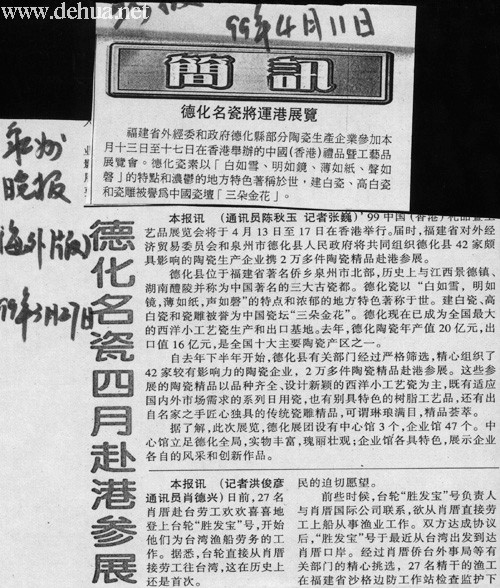 福建省外經(jīng)委和政府德化縣部分陶瓷生產(chǎn)企業(yè)參加本朋十三日至十七日在香港舉辦的中國(guó)(香港)禮品暨工藝品展覽會(huì)。德化瓷素以『白如雪、明如鏡、薄如紙、聲如磬』的特點(diǎn)和濃郁的地方特色著稱于世,建白瓷、高白瓷和瓷雕被譽(yù)為中國(guó)瓷壇『三朵金花』。