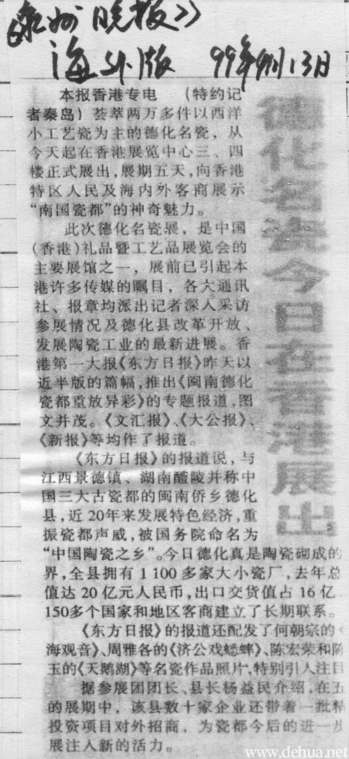此次德化名瓷展,是中國(香港)禮品暨工藝品展覽會的主要展館之一,展前已引導(dǎo)起本港許多傳媒的矚目,各大通訊社、報章均派出記者深入采訪參展情況及德化縣改革開放、發(fā)展陶瓷工業(yè)的最新進展。香港第一大報《東方日報》昨天以近半版的篇幅,推出《閩南德化瓷都重放異彩》的專題報道,圖文并茂!段膮R報》、《大公報》、《新報》等均作了報道。