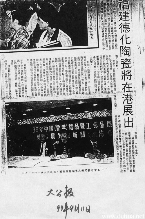 福建省對(duì)外經(jīng)濟(jì)貿(mào)易委員會(huì)和福建省德化縣人民政府共同組織德化縣部分陶瓷生產(chǎn)企業(yè)參加四月十三日——十七日在香港舉辦的九九中國(guó)(香港)禮品暨工藝品展覽會(huì),德化名瓷展覽將于該日起在香港展覽中心三四層正式開(kāi)展,展期五天。