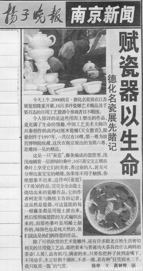 今天上午,2000南京·德化名瓷展在江蘇展覽館隆重開幕,10萬多件瓷雕藝術(shù)精品及千姿百態(tài)的日用工藝瓷器令參觀者目不暇接。
