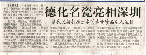 【本報(bào)訊】 (記者饒潔)昨日,被譽(yù)為“瓷國明珠”的福建省德化縣在深圳高交會館舉行名瓷展覽會,來自德化的120多家企業(yè)精心組織了十萬件產(chǎn)品參展,吸引了海內(nèi)外客商的關(guān)注。
