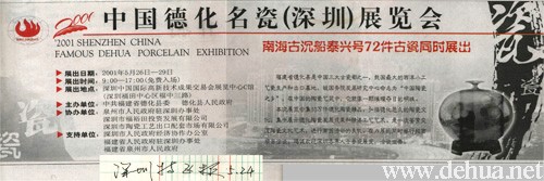 本次展覽會集10萬件德化陶瓷精品,弘揚德化悠久的陶瓷文化,集中展示德化陶瓷發(fā)展成果和精湛工藝藝術(shù)。是一次鑒賞廣交流陶瓷文化藝術(shù),進行商貿(mào)活動的良機。在辦展的同時舉行招商項目洽談,竭誠歡迎深圳各界人士參觀展覽,洽談業(yè)務。