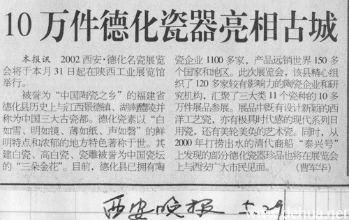 本報(bào)訊2002西安·德化名瓷展覽會(huì)將于本月31日起在陜西工業(yè)展覽館舉行。