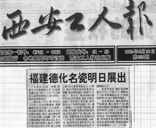 本報(bào)訊(記者中原)被譽(yù)為“中國(guó)陶瓷之鄉(xiāng)”的福建省德化縣,明臼一6月4日在陜西工業(yè)展覽館舉辦2002西安德化名瓷展覽會(huì)。