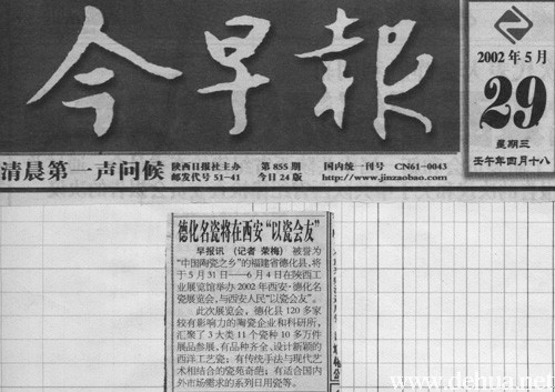 早報(bào)訊  (記者榮梅) 被譽(yù)為“中國陶瓷之鄉(xiāng)”的福建省德化縣,將于5月31日—6月4日在陜西工業(yè)展覽館舉辦2002年西安·德化名瓷展覽會(huì),與西安人民“以瓷會(huì)友”。