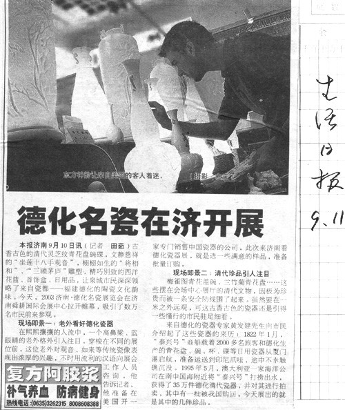 本報濟南9月10日訊(記者  田茹)古香古色的清代靈芝紋青花盤碗碟,文靜慈祥的“坐蓮十八手觀音”,栩栩如生的“將相和”、“三顧茅廬”雕塑,精巧別致的西洋花籃、首飾盒、日用品,讓泉城市民深深領(lǐng)略了來自瓷都——福建德化的陶瓷文化韻味。今天,2003濟南·德化名瓷展覽會在濟南舜耕國際會展中心拉開帷幕,吸引了數(shù)萬名市民前來參觀。