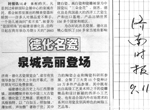 時(shí)報(bào)訊(記者 張彤)昨天,凡是到過舜耕國(guó)際會(huì)展中心的泉城市民,都會(huì)被那里展出的精美瓷器所傾倒——許多人對(duì)展品愛不釋手,一個(gè)勁兒地詢問“賣不賣”。被譽(yù)為“瓷國(guó)明珠”的福建省德化縣,自昨日起在我市舉辦為期5天的“2003濟(jì)南·德化名瓷展覽會(huì)”,省市有關(guān)領(lǐng)導(dǎo)參加了昨天上午的開幕式,市民朋友可以免費(fèi)參觀。