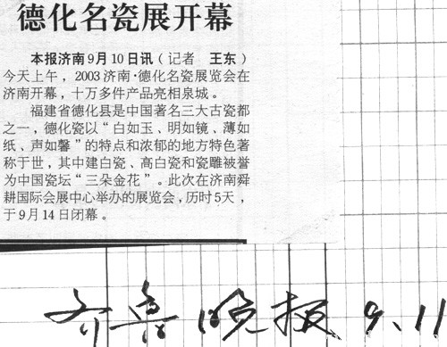 福建省德化縣是中國(guó)著名三大古瓷都之一,德化瓷以“白如玉、明如鏡、薄如紙、聲如馨”的特點(diǎn)和濃郁的地方特色著稱(chēng)于世,其中建白瓷、高白瓷和瓷雕被譽(yù)為中國(guó)瓷壇“三朵金花”。此次在濟(jì)南舜耕國(guó)際會(huì)展中心舉辦的展覽會(huì),歷時(shí)5天,于9月14日閉幕。