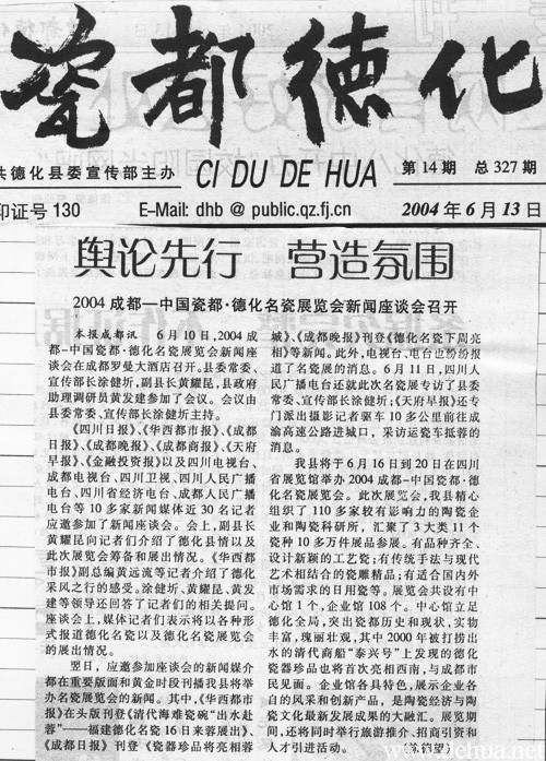 翌日,應(yīng)邀參加座談會(huì)的新聞媒介都在重要版面和黃金時(shí)段刊播我縣將舉辦名瓷展覽會(huì)的新聞。其中,《華西都市報(bào)》在頭版刊登《清代海難瓷碗“出水赴蓉”——福建德化名瓷16日來(lái)蓉展出》、《成都日?qǐng)?bào)》刊登《瓷器珍品將亮相蓉城》、《成都晚報(bào)》刊登《德化名瓷下周亮相》等新聞。此外,電視臺(tái)、電臺(tái)也紛紛報(bào)道了名瓷展的消息。6月11日,四川人民廣播電臺(tái)還就此次名瓷展專訪了縣委常委、宣傳部長(zhǎng)涂健圻;《天府早報(bào)》還專門(mén)派出攝影記者驅(qū)車10多公里前往成渝高速公路進(jìn)城口,采訪運(yùn)瓷車抵蓉的消息。