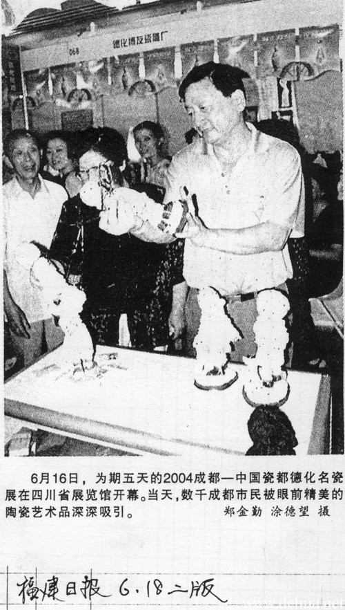 6月16日,為期五天的2004成都—中國(guó)瓷都德化名瓷展在四川省展覽館開(kāi)幕。當(dāng)天,數(shù)千成都市民被眼前精美的陶瓷藝術(shù)品深深吸引。