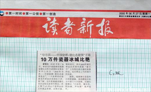 26日,被譽(yù)為中國瓷都的福建省德化在哈爾濱國際會展體育中心舉辦“2005哈爾濱——中國瓷都·德化名瓷展覽會”。一大批精美的瓷器名作將首次亮相哈爾濱。據(jù)了解,這次是福建省德化首次在哈爾濱舉行展會,共匯聚了3大類11個瓷種10余可件展品參展,實物豐富、精美絕倫。其中2000年被打撈出水的清代商船“泰興號”上發(fā)現(xiàn)的部分德化瓷器珍品,也在展會上與冰城市民見面。