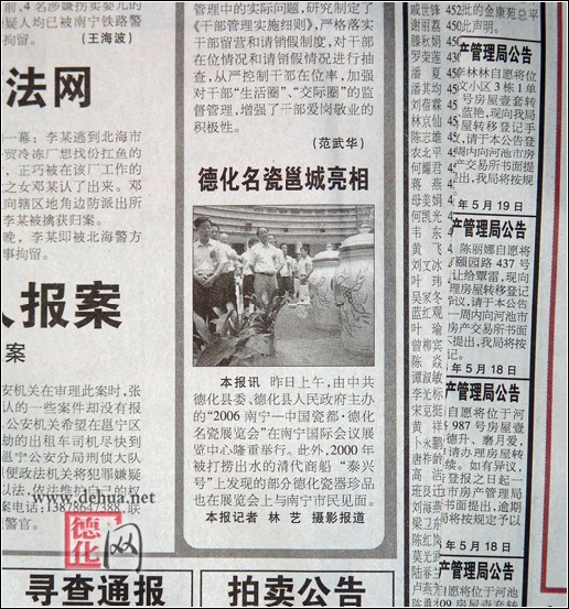 昨日上午,由中共德化縣委、德化縣人民政府主辦的“2006南寧——中國(guó)瓷都·德化名瓷展覽會(huì)”在南寧國(guó)際會(huì)議展覽中心隆重舉行。此外,2000年被打撈出水的清代商船“泰興號(hào)”上發(fā)現(xiàn)的部分德化瓷器珍品也在展覽會(huì)上與南寧市民見面。