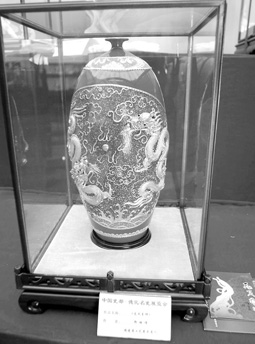 記者在現(xiàn)場看到:在一號展館的企業(yè)展區(qū)里,共有90多個企業(yè)展位。076號展位展出的是濟公系列瓷器作品,共有幾十件,看,這個狡黠多智的濟公,還會向人吐舌頭;051號展位的展主,正在向觀眾演示瓷器的高科技——可以自動出水的茶壺,把杯子放在壺嘴下,茶水就自動地流到杯子里,杯滿了,壺嘴又自動停水,讓人連連稱奇。而064號展位的國瓷苑展出的均是國家級禮品,雍容華貴,一件雕著金龍的高溫紅釉作品,含金量高達90%以上。