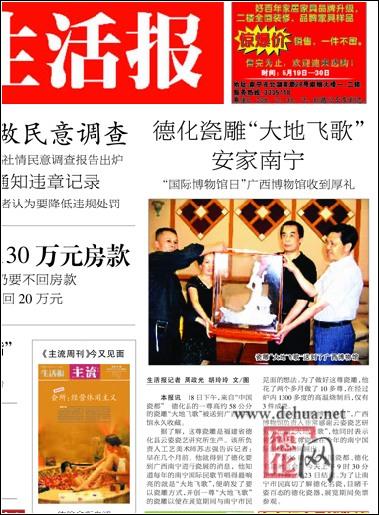 2006年5月18日下午,來自“中國瓷都”德化縣的一尊高約58公分的瓷雕“大地飛歌”被送到廣西博物館永久收藏。