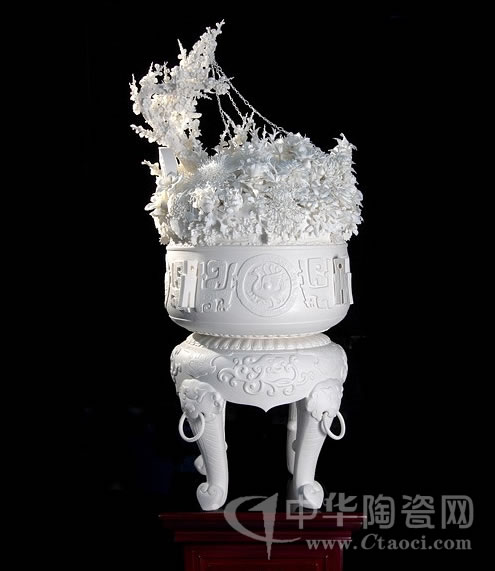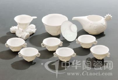 收藏版瓷雕茶具《八月一日》,蓋碗的壺鈕創(chuàng)意為日月同輝,茶杯上的梅花,寓意中國人民解放軍在漫長的革命歲月中,凌霜傲雪,英勇頑強,奪取革命勝利的軍魂。茶海的把手綴有閃閃的“八一”徽章,茶杯的把手分別雕為“8”與“0”,象征中國人民解放軍建軍80周年,軍人的風采,永遠輝煌。創(chuàng)意最逗人尋味的是茶托上戴軍帽的“六子爭頭”。陳仁海大師把喜慶氣氛很濃的民間傳統(tǒng)文化融入正統(tǒng)的軍事題材中, 六子爭頭活潑喜人,別具匠心,人見人愛,寓意民擁軍,軍愛民,由弱到強的解放軍80年的發(fā)展歷程,更憧憬著美好的未來。