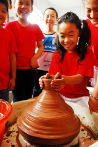 最讓孩子們驚奇的是拉坯,一大塊坯料在陶藝工作室工作人員手中一會(huì)兒就變成了一件藝術(shù)品,孩子們“哇賽”聲不斷,個(gè)個(gè)躍躍欲試,當(dāng)真正上場(chǎng)拉坯時(shí),孩子們才發(fā)現(xiàn)拉坯還真不容易。