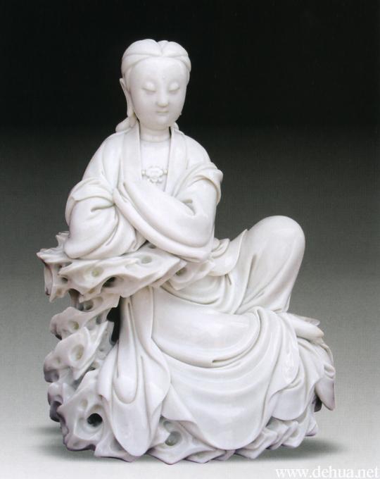 觀音雙目微沉,側(cè)坐于巖上,雙手?jǐn)n于袖中,右肘支于巖石,神態(tài)安詳,衣褶飄逸,富有變化。整尊塑像造型豐腴、細(xì)膩,精雕細(xì)刻,具有獨特的藝術(shù)風(fēng)格。