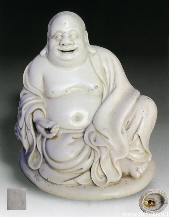 彌勒笑容可掬,雙目炯然有神,右手托珠,盤坐于蒲團(tuán)之上,寬袍長袖,衣袂圓潤,背鈐有“何朝宗”葫蘆印。釉水溫潤,造型形象生動,令人嘆為觀止。