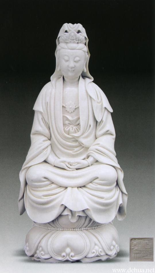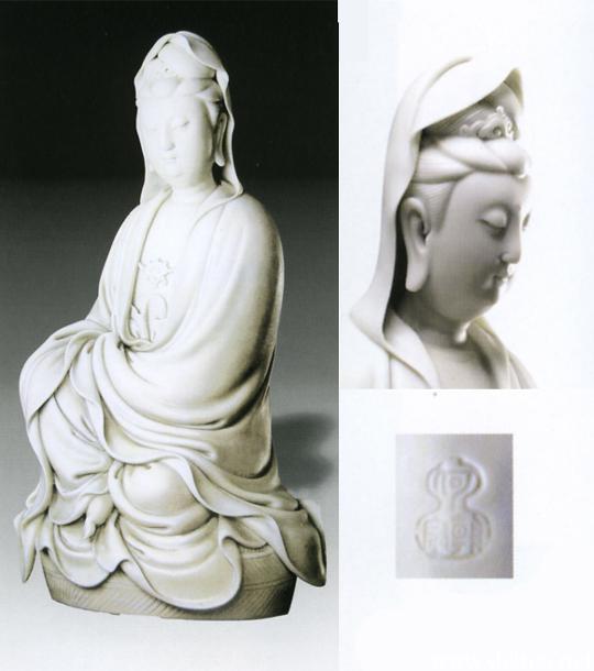 觀音盤膝而坐,面容慈祥,溫良嫻雅,帶有明顯的男子氣質(zhì);其衣紋線條柔潤流暢,頭部、酥胸、手腳等細(xì)部刻劃細(xì)膩,整尊塑像以象牙白為瓷質(zhì),將觀音善良、正直、莊嚴(yán)的神態(tài)表現(xiàn)得惟妙惟肖。背部鈐有“何朝宗”葫蘆形印章款。