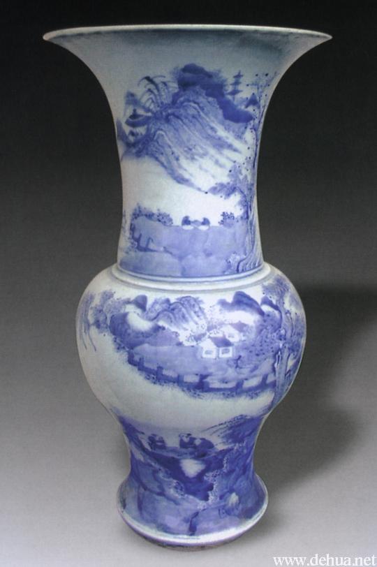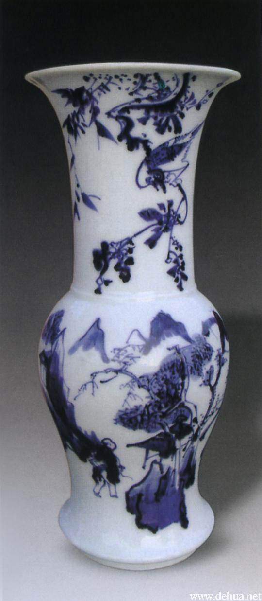 賞析:童子肩扛芭蕉葉,舉目遠(yuǎn)望,頗有“山外青山”之意境,瓶口飾有喜鵲登枝紋,畫風(fēng)率意,瓶體飽滿,釉色滋潤,不愧為德化窯青花瓷之精品。