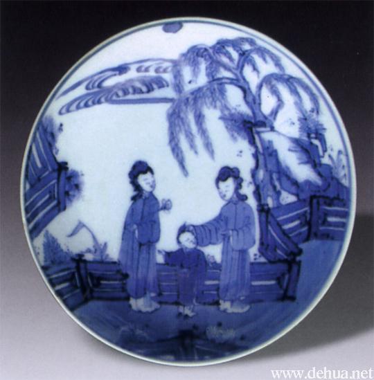 ▲清早期 青花“黛玉葬花”紋盤(陳明良藏) 口徑26厘米