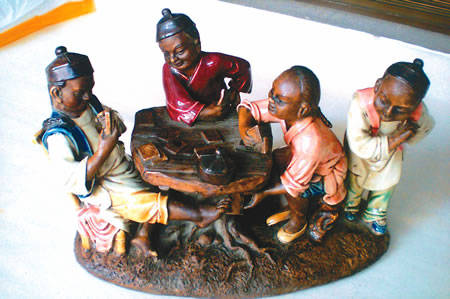 童趣:這組瓷塑人物像,一覽無余地構造出兩個童子在玩牌過程中的串通手法,就是以桌子和帽子作遮掩,把對方所需要的牌用腳趾夾過去,而玩牌的第三方童子卻茫然不知,這一情景卻被站在旁邊的童子發(fā)現了。這件作品妙在瓷塑大師把這一瞬間定格下來,表現出串通方童子的心機和巧妙。在現實生活中,不是也有不少人在演繹著類似的作弊手法嗎?