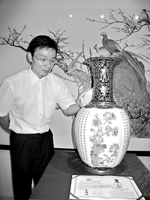 最突出的亮點是在中國陶瓷史上占有重要地位的青花瓷器。在這次展覽中,元代、明成化和清康熙的精品青花瓷器同臺亮相最為難得。而價格最貴的高仿珍瓷是高達63.5厘米的粉彩霽藍描金花卉詩句大瓶(如右圖)。文物專家曹靜樓告訴記者,為了最大限度還原20件國寶瓷器的原貌,從前期準備到最終燒造成功,歷時長達3年之久。每一件精品力作都反映了當時最高工藝水平。