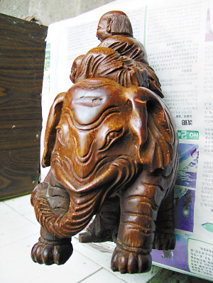 傅老師:從照片判斷,這是一個(gè)人物騎象木刻,而且此件木刻年代應(yīng)該不會(huì)太久,并不是舊物。因?yàn)樵撃究虥](méi)有舊的包漿,一般木質(zhì)工藝品經(jīng)過(guò)一定時(shí)期撫玩以后,都會(huì)留有“手漬”,也就是我們常見(jiàn)的因摩擦導(dǎo)致的刮痕。由于是新品并非舊物,價(jià)值也就不是很高。