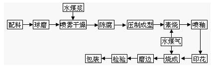 該陶瓷廠的生產(chǎn)流程圖。通過現(xiàn)場考察和監(jiān)測,得知水煤氣的制取、粉料的制取和陶瓷的燒成這三個工段所產(chǎn)生的余熱是最大的。