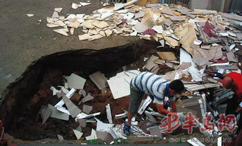 7月3日上午9時(shí)許,膠南市瑯琊臺(tái)路南端突然發(fā)生公路塌方事件,形成的大坑將馬路邊一家陶瓷專賣店價(jià)值近萬元的瓷磚“吞掉”。記者在現(xiàn)場看到,塌下的大坑深5米,長8米,寬有4米,里面填滿了破碎的瓷磚。據(jù)介紹,塌方處的公路下面有管道,沙土比較松軟,上面長期放置著大量瓷磚形成壓力,再加上近期連降大雨,因此造成塌方。